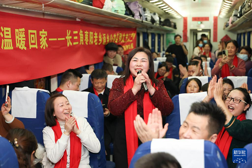 2月11日,棗陽(yáng)籍務(wù)工人員在K1127次列車上自編自演節(jié)目。(新華社記者 王翔 攝)