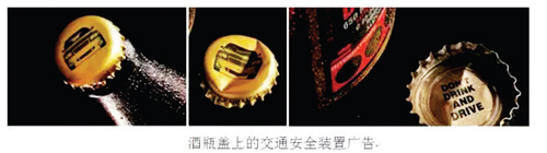 美國將警示語作為酒品包裝的強(qiáng)制性標(biāo)注內(nèi)容,要求飲料,酒的品牌標(biāo)簽、獨(dú)立的前標(biāo)簽或者背標(biāo)簽、側(cè)標(biāo)簽都應(yīng)獨(dú)立,并有別于標(biāo)簽中其他信息地標(biāo)示:“政府警示,根據(jù)普通外科醫(yī)生建議,孕婦不應(yīng)該飲酒,以防止新生兒缺陷,飲酒會(huì)減弱個(gè)人駕駛車或操控機(jī)械的能力并可能引發(fā)健康問題。”此外,國外的產(chǎn)品包裝設(shè)計(jì)上也植入了公益理念。如上圖廣告可對(duì)飲酒人群針對(duì)性的進(jìn)行廣告宣傳,采用打開酒瓶蓋必須以破壞“車輛”為代價(jià)的形式,傳達(dá)喝酒不能開車的安全理念。