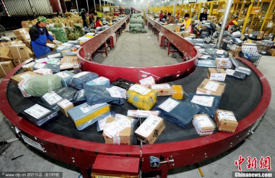 圖為快遞公司員工在忙碌分發(fā)郵件。圖片來源:CFP視覺中國