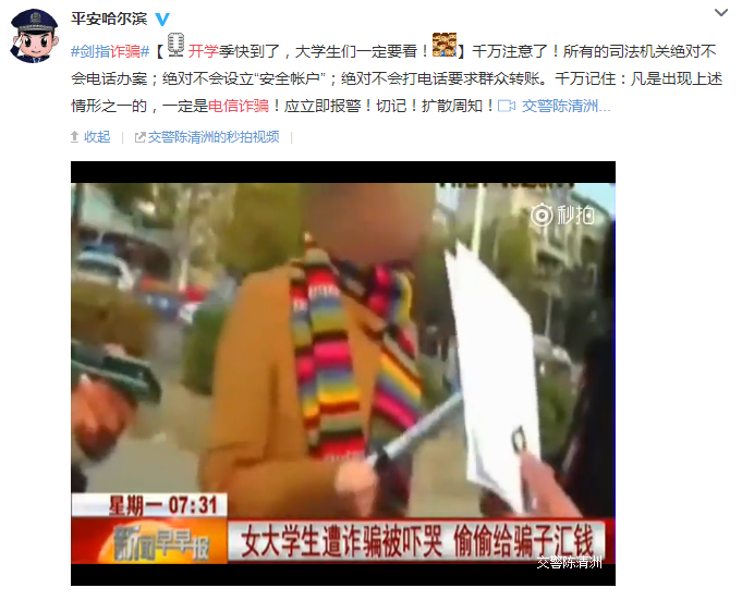 近日,一則新聞視頻在社交網(wǎng)絡(luò)上廣為流傳,一名女大學(xué)生聽信了冒充刑警的詐騙犯,前往銀行匯款,幸好被銀行工作人員及時發(fā)現(xiàn)并制止。視頻中,直到女孩的家長和真正的警察出現(xiàn),女孩仍然對騙子的話深信不疑,騙子忽悠功力可見一斑。