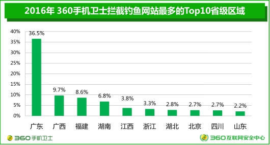 360大數(shù)據(jù)對(duì)釣魚(yú)網(wǎng)站地域分布也進(jìn)行了精準(zhǔn)分析,整體來(lái)看,手機(jī)端釣魚(yú)網(wǎng)站攔截量占比最高的地區(qū)為廣東省,以壓倒性的36.5%位居榜首;其次為廣西(9.7%)、福建(8.6%)、湖南(6.8%)和江西(3.8%)。