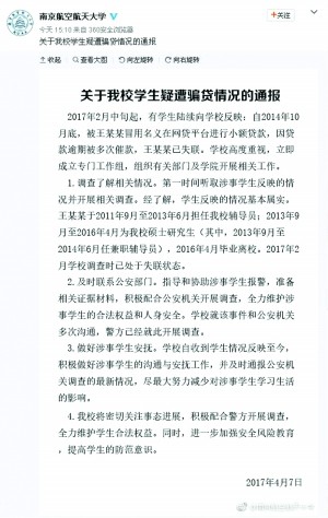 在4月7日下午,“@南京航空航天大學(xué)”官微發(fā)布了“關(guān)于我校學(xué)生疑遭騙貸情況的通報(bào)”,通報(bào)稱,從2017年2月中旬起,有學(xué)生陸續(xù)向?qū)W校反映,自2014年10月底,被王某冒用名義在網(wǎng)貸平臺(tái)進(jìn)行小額貸款,因貸款逾期被多次催款,王某已失聯(lián)。學(xué)校高度重視,立即成立專門工作組,組織有關(guān)部門及學(xué)院開展相關(guān)工作。經(jīng)調(diào)查了解,學(xué)生反映的情況基本屬實(shí)。
