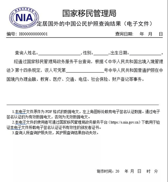 國家移民管理局相關負責人表示,根據(jù)《中華人民共和國電子簽名法》和《中華人民共和國政府信息公開條例》有關規(guī)定,華僑個人經(jīng)上述途徑所獲得的查詢結(jié)果電子文件已經(jīng)國家移民管理局電子簽名,與同類紙質(zhì)文件具有相同效力,華僑可將電子文件向有關辦事服務機構(gòu)出示或提供。