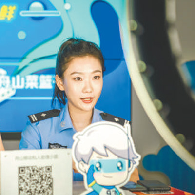 浙江省舟山市公安局反詐中心民警通過網(wǎng)絡直播傳授電信網(wǎng)絡詐騙防范知識。鄒訓勇攝(人民視覺)
