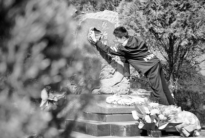 2021年4月4日,河南信陽,一位烈士后人在鄂豫皖蘇區(qū)首府烈士陵園里擦拭墓碑。新華社發(fā)
