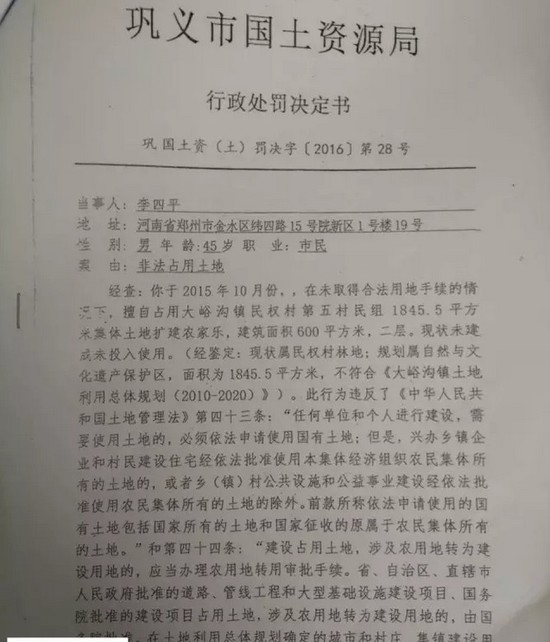 據(jù)記者獲取的材料顯示,2015年12月份,鞏義市國(guó)土資源局對(duì)李四平進(jìn)行處罰,案由為“非法占地”。李四平擅自占用集體土地126平方米,建設(shè)農(nóng)家樂(lè),土地性質(zhì)為林地。對(duì)其處罰為“自行拆除在非法占用的126平方米土地上新建的建筑物和其他設(shè)施,恢復(fù)土地原狀”“對(duì)非法占用的126平方米土地,按每平方米3元處以罰款,共378元?!?/p>
