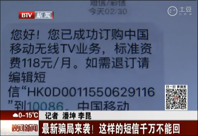 中國經(jīng)濟網(wǎng)北京11月4日訊 “您好!您已成功訂購中國移動無線TV業(yè)務(wù),標(biāo)準(zhǔn)資費118元/月。如需退訂,請編輯短信HK***到10086?!局袊苿印俊?1月2日北京電視臺《晚間新聞》報道,近日,北京市民王小姐收到了“中國移動”發(fā)來的這樣一條服務(wù)訂購短信。