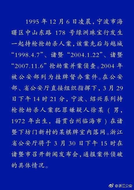 官方通報(bào) 最新消息:浙江省公安廳將于3月30日下午15時(shí)在諸暨市召開新聞發(fā)布會(huì),通報(bào)案件偵破的具體情況。 盡管已過(guò)去了22年 綠洲珠寶行已從原來(lái)的中山東路搬到天一廣場(chǎng) 但說(shuō)到轟動(dòng)浙江的“綠洲珠寶行搶劫殺人案” 很多“老寧波”還是記憶猶新