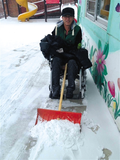 今年冬天,戴著假肢,坐著輪椅的宋學(xué)文在吉林老家掃雪。受訪(fǎng)者供圖