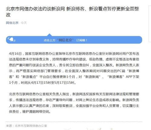 新浪網(wǎng)負責人表示,將嚴格落實網(wǎng)信部門管理要求,在全面深入整改期間對問題突出的PC端“新浪博客”和“新浪看點”平臺自行暫停更新1個月,對“新浪新聞”、“新浪博客”APP下架1個月,時間從4月17日15時至5月17日15時。