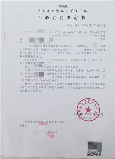 濟(jì)南市公安局歷下區(qū)分局出具的行政處罰決定書顯示,冒用韓曉強(qiáng)身份證者被行政拘留5日。