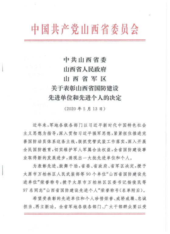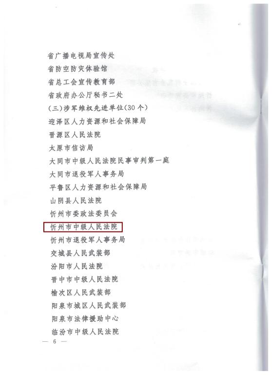 近日,中共山西省委、山西省人民政府、山西省軍區(qū)下發(fā)了《關(guān)于表彰山西省國防建設(shè)先進(jìn)單位和先進(jìn)個人的決定》,忻州中院被授予“山西省國防建設(shè)涉軍維權(quán)先進(jìn)單位”榮譽稱號。