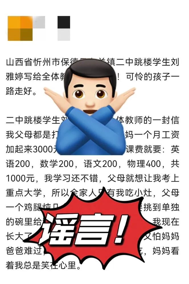 2024年3月18日,忻州網(wǎng)警在工作中發(fā)現(xiàn),網(wǎng)民鄔某在某平臺(tái)發(fā)文稱“山西省忻州市保德縣東關(guān)鎮(zhèn)二中跳樓學(xué)生小劉(化名)寫(xiě)給全體教師的一封信”。