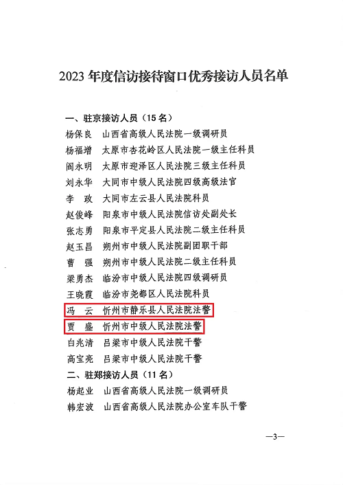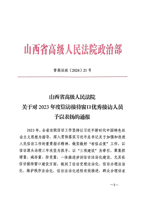近日,山西省高級人民法院下發(fā)《關于對2023年度信訪接待窗口優(yōu)秀接訪人員予以表揚的通報》,忻州法院2名干警榜上有名。忻州中院黨組書記、院長栗向東作出批示,要求全市法院干警以受到表揚的同志為榜樣,愛崗敬業(yè),爭當先進,爭創(chuàng)一流工作業(yè)績。