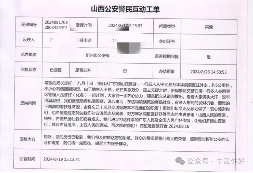 群眾無小事,點滴映初心。8月19日,寧武縣公安局收到忻州市公安局轉(zhuǎn)來的山西公安警民互動工單,廣東省的嚴(yán)先生在平臺留言致謝:“8月10日,我們從廣東到山西旅游,一行四人從寧武縣萬年冰洞景區(qū)往外走,不小心右側(cè)翻到溝里。由于人生地不熟,正在焦急萬分,孤立無援之時,貴局景區(qū)民警白濤一行多人會同景區(qū)管理人員一起趕到,大家齊心協(xié)力,硬是把車從道溝推出.....山西人民的厚道淳樸、古道熱腸讓我們終身難忘,我們決定將這件事向廣東人民及全國人民友好傳播,讓他們多到山西旅行,體驗古晉遺風(fēng),山西人民的真誠。再次感謝你們!”