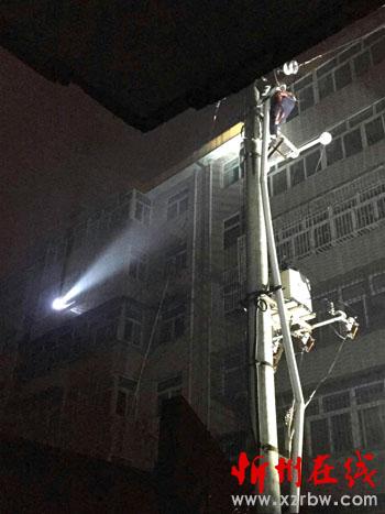 客戶從自家陽(yáng)臺(tái)上用手電筒為搶修隊(duì)員照明協(xié)助搶修