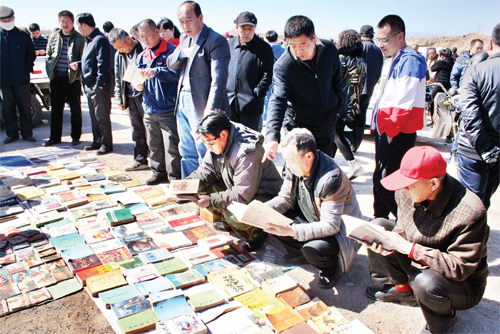 3月14日,原平市文化路集貿市場圖書飄香,市民們正在挑選自己喜愛的書籍。該市著力打造文化強市,處處彰顯文化氛圍。(趙春曉 攝)