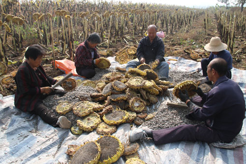10月13日,原平市解村鄉(xiāng)圪坨村林同種植專業(yè)合作社正在收獲向日葵,該社引進三瑞公司種植1000余畝SH363向日葵喜獲豐收。近年來,該市積極引導農(nóng)民調(diào)整農(nóng)業(yè)產(chǎn)業(yè)結(jié)構(gòu),采取“合作社+農(nóng)戶”的模式,向日葵比玉米收入高四倍,銷售價每斤4塊左右,合作社為農(nóng)戶提供種子、種植技術(shù)等服務(wù),帶動當?shù)厝罕娫鍪罩赂弧?span style="font-family: 楷體,楷體_gb2312, simkai">圖為解村鄉(xiāng)村民趁著秋高氣爽的晴好天氣,在田間地頭葵花籽的情景。(褚震 攝)