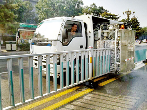 交通護(hù)欄可為市民、車輛出行提供安全保障,可人工清洗護(hù)欄工作耗時耗力,還存在安全隱患。新購置的護(hù)欄清洗車通過伸縮刷子以及車載水箱噴出的水流,完成護(hù)欄清洗,工作效率遠(yuǎn)遠(yuǎn)高于人工清洗,省時又省力,效果還明顯。圖為清洗車正在對城區(qū)交通護(hù)欄進(jìn)行清洗。(張志遠(yuǎn) 孫明 攝)