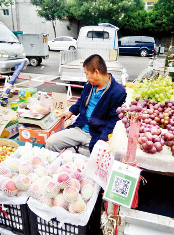 7月30日,位于和平街市中級人民法院旁的便民市場上,一位水果商販正在出售水果。三輪車上掛著微信支付二維碼,告訴顧客可以用手機掃一掃買水果。小販說:“現(xiàn)在用手機支付的人越來越多,特別是年輕人。手機支付,不用找零,不怕假幣,‘掃一掃’,就是好!”