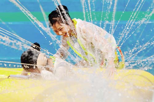 7月16日,孩子們?cè)诮K省淮安市盱眙縣玉皇山水上樂園戲水消暑。新華社 周海軍 攝