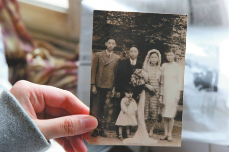 廖思源從家里的木質(zhì)老式柜子里,拿出一本相冊。他用布滿皺紋的手翻開,拿出一張黑白婚紗照,看了又看:廖思源身著白襯衣和西裝,打著領(lǐng)帶,看起來格外精神。鐘貞淑頭戴婚紗,一席花色的長裙,右手捧著鮮花。兩人手挽著手,表情有點嚴(yán)肅,濃濃的年代感將時間拉回到了1949年。