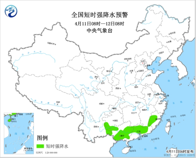 預(yù)計(jì)4月11日08時(shí)至12日08時(shí),貴州西南部、福建西南部、廣西西部和東部、廣東西北部等地的局地將有8-10級雷暴大風(fēng)或冰雹天氣;此外,貴州西南部、福建西部、廣西大部、廣東中北部等地的部分地區(qū)將有短時(shí)強(qiáng)降水天氣,小時(shí)雨強(qiáng)20-40毫米,局地可達(dá)50毫米以上。