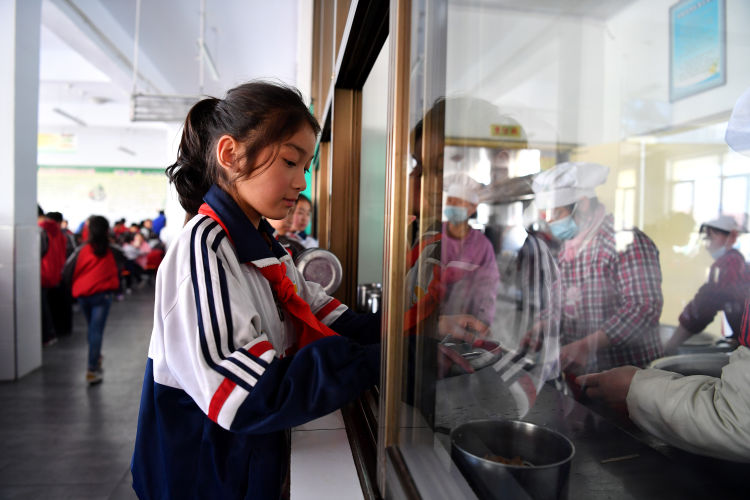 ↑這是學(xué)生們在食堂排隊(duì)打飯(4月16日攝)。新華社記者詹彥攝