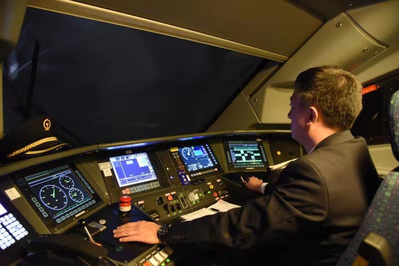當D6770次列車到達呼和浩特東站,弓國慶登上機車,與換班司機交接完畢后,插入IC卡,認真核對行車數(shù)據(jù)、確認操縱臺各儀表……各項安全準備工作無誤后,隨著機車前方發(fā)車信號變?yōu)榫G燈,與車站進行車機聯(lián)控確認,隨著一聲汽笛長鳴,動車組緩緩駛出呼和浩特東站?!皬氐撞t望,確認信號,高聲呼喚,手比眼看”的標準化作業(yè)與每三十秒腳踩提醒踏板的一系列操作流暢默契……盡管這種周而復始的工作他已重復了成千上萬遍,但從不敢松懈。