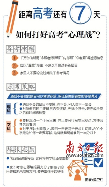 張敏強(qiáng)不忘囑咐家長,要創(chuàng)造寬松、良好的環(huán)境,讓考生輕松上陣。“一定要讓孩子休息好,補(bǔ)品不要吃太多,家里其他的人,不要每個人都過問。”他還提醒,所有的高考用具,要備份一套。