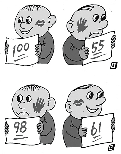 一個(gè)孩子考了100分,受到表揚(yáng)。后來考了98分,結(jié)果被打了耳光;另一孩子考了55分,被打了耳光。第二次考了61分,卻受到表揚(yáng):這幅名為《進(jìn)步與退步》的四格漫畫,入選為2016年高考全國卷1的作文題目。