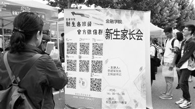 9月1日,中央財(cái)經(jīng)大學(xué)新生報(bào)到現(xiàn)場,金融學(xué)院的學(xué)生邀請新生掃碼入群。李涓 攝