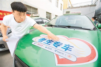 網(wǎng)絡(luò)出行平臺高德打車聯(lián)合有關(guān)方面推出“愛心送考 ”免費服務(wù)。圖為參與提供服務(wù)的工作人員給車貼相關(guān)標識。
