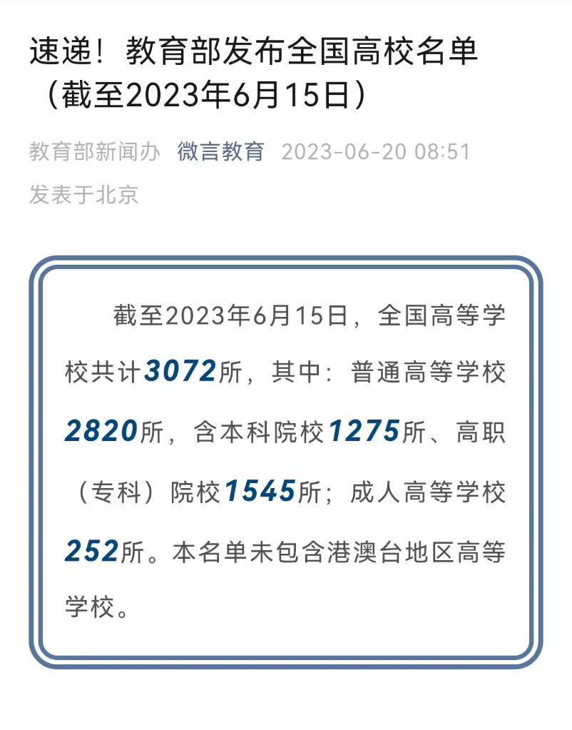 記者6月20日從教育部獲悉,根據(jù)近日發(fā)布的全國高校名單,截至2023年6月15日,全國高等學(xué)校共計3072所,其中普通高等學(xué)校2820所,含本科院校1275所、高職(專科)院校1545所;成人高等學(xué)校252所。