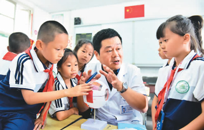 近日,在貴州省黔東南苗族侗族自治州從江縣城關第三小學,眼科醫(yī)生給學生講解健康用眼知識。(石宏輝 攝 人民視覺)