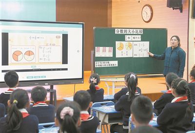 在上海市楊浦區(qū)平?jīng)雎返谌W(xué)的“教學(xué)助手”展示課上,老師在黑板上進(jìn)行知識(shí)點(diǎn)講解分析,顯示屏上有學(xué)生們的人機(jī)互動(dòng)結(jié)果和學(xué)習(xí)效果的統(tǒng)計(jì)數(shù)據(jù)。 新華社記者 劉穎攝