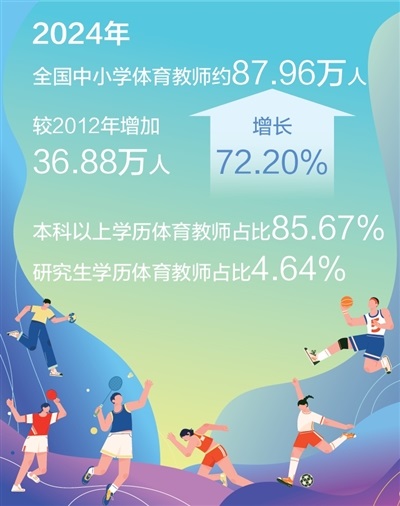 近年來,我國(guó)中小學(xué)體育教師隊(duì)伍不斷壯大。2024年全國(guó)中小學(xué)體育教師約87.96萬人,較2012年增加36.88萬人,增長(zhǎng)72.20%。特別是近5年,全國(guó)體育教師數(shù)量增速明顯,師資補(bǔ)充力度加大。