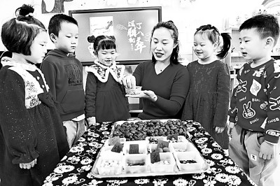 山東省濱州市濱城區(qū)清怡幼教集團彭李街道中心幼兒園,孩子們在老師指導(dǎo)下辨識制作臘八粥的食材。 初寶瑞攝/光明圖片