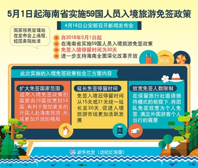 “擴大免簽國范圍;延長免簽停留時間;放寬免簽人數(shù)限制?!?月18日,公安部在京召開新聞發(fā)布會,國家移民管理局在發(fā)布會上通報:經(jīng)國務(wù)院批準,自2018年5月1日起,在海南省實施59國人員入境旅游免簽政策,進一步支持海南全面深化改革開放。