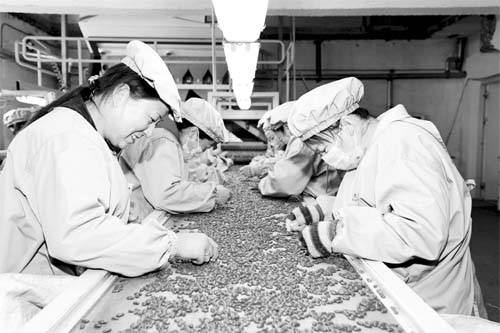 岢嵐縣信用聯(lián)社扶持該縣泰達貿(mào)易有限公司擴大流水線、增加產(chǎn)品統(tǒng)購,有效地帶動當?shù)亍耙淮逡黄贰碑a(chǎn)業(yè)鏈良性循環(huán)發(fā)展。圖為泰達貿(mào)易有限公司工人們正在篩檢紅蕓豆。