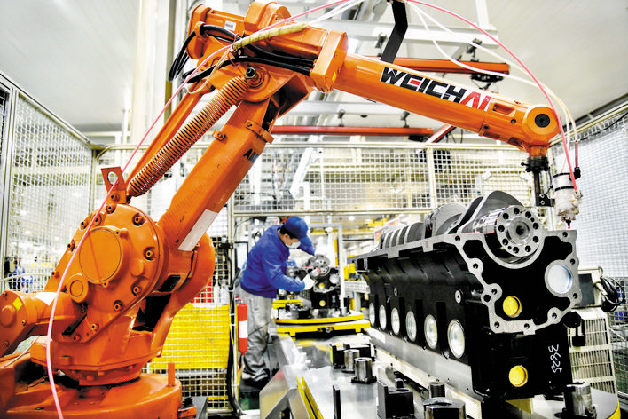 在位于山東濰坊的濰柴集團一號工廠總裝車間,工人們在流水線上裝配發(fā)動機(3月19日攝)。 3月31日,國家統(tǒng)計局服務業(yè)調(diào)查中心、中國物流與采購聯(lián)合會發(fā)布數(shù)據(jù),3月份,中國制造業(yè)采購經(jīng)理指數(shù)(PMI)為52%,比上月回升16.3個百分點。