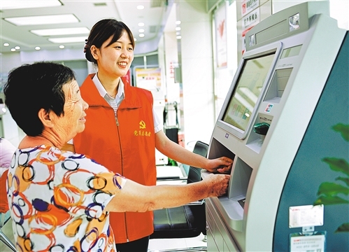 湖南邵陽(yáng)農(nóng)商銀行黨員志愿者向客戶介紹銀行查詢機(jī)使用方法。滕治中攝(中經(jīng)視覺)