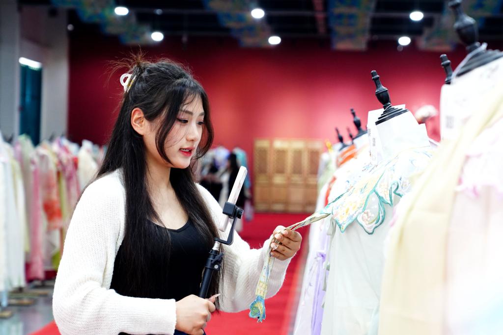 “85后”的黃曉燕曾在南方打拼十余年,如今成為曹縣穿越大唐漢服云倉經(jīng)理?!半m然是在鄉(xiāng)鎮(zhèn)工作,但貼近市場,節(jié)奏非???,每天顧客絡(luò)繹不絕。”她在展廳里邊走邊介紹,公司自主設(shè)計的漢服涵蓋唐、宋、明、清等品類,并根據(jù)人們?nèi)粘Vb特點加以改良。在這里,不僅能夠私人訂制服裝,還有AI直播改善線上消費體驗。