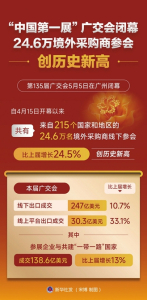 第135屆廣交會5日在廣州閉幕。自4月15日開幕以來,共有來自215個國家和地區(qū)的24.6萬名境外采購商線下參會,比上屆增長24.5%,創(chuàng)歷史新高。本屆廣交會線下出口成交247億美元,線上平臺出口成交30.3億美元,分別比上屆增長10.7%和33.1%。