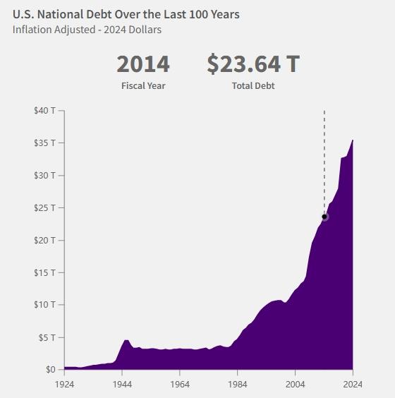 △美國財(cái)政部下屬的財(cái)務(wù)數(shù)據(jù)網(wǎng)站披露的數(shù)據(jù)顯示,美國國債總額從2014年的23.64萬億美元升至2024年的超36萬億美元,漲幅超52%,這一趨勢(shì)整體上仍在持續(xù)加快。