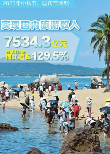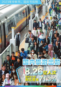 經(jīng)文化和旅游部數(shù)據(jù)中心測(cè)算,2023年中秋節(jié)、國(guó)慶節(jié)假期,全國(guó)國(guó)內(nèi)旅游出游人數(shù)8.26億人次,同比增長(zhǎng)71.3%,按可比口徑較2019年增長(zhǎng)4.1%;實(shí)現(xiàn)國(guó)內(nèi)旅游收入7534.3億元,同比增長(zhǎng)129.5%,按可比口徑較2019年增長(zhǎng)1.5%。