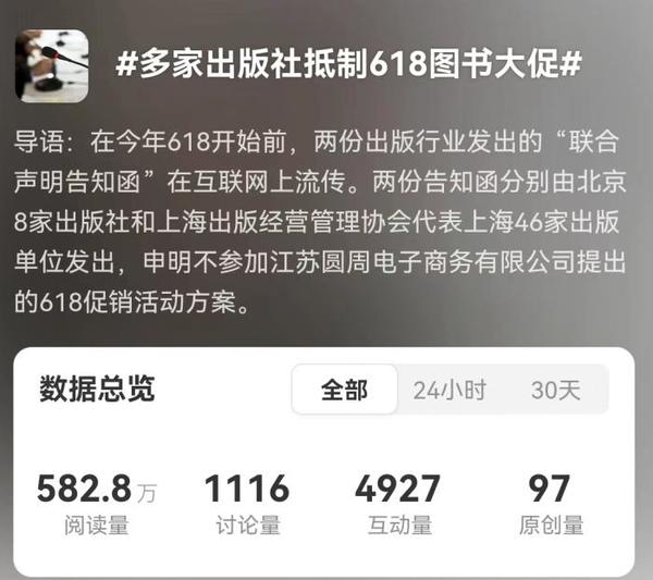 日前,兩份來(lái)自出版行業(yè)的“聯(lián)合聲明告知函”在網(wǎng)上流傳,引發(fā)大范圍討論,并最終成為一個(gè)焦點(diǎn)話(huà)題,“多家出版社抵制618圖書(shū)大促”。