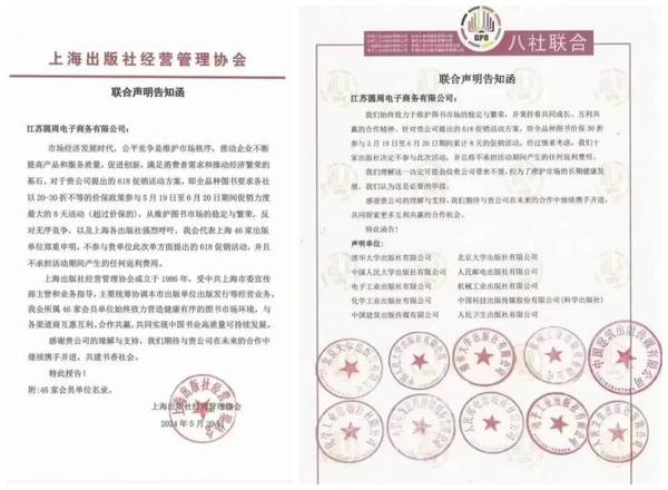 網(wǎng)上流傳的兩份“聯(lián)合聲明告知函”顯示,北京的一些出版社,以及上海出版社經(jīng)營(yíng)管理協(xié)會(huì)代表上海46家出版單位,均聲明不參與江蘇圓周電子商務(wù)有限公司此次提出的618促銷(xiāo)活動(dòng)方案,也不承擔(dān)活動(dòng)期間產(chǎn)生的任何返利費(fèi)用。