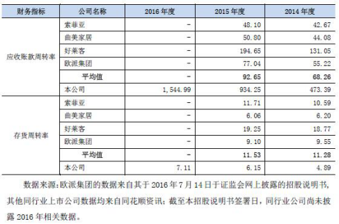 2014至2016應(yīng)收賬款周轉(zhuǎn)率及存貨周轉(zhuǎn)率與同行業(yè)公司對比(來源:招股書)