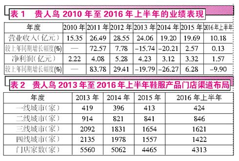 不過,貴人鳥似乎在前期擴(kuò)張的過程中“用力過猛”,在2014年上市之后,貴人鳥的門店數(shù)量開始出現(xiàn)大規(guī)模萎縮。貴人鳥在國內(nèi)布局的門店家數(shù)一路下滑,已經(jīng)由2013年時(shí)的5560家下滑至2016年上半年的4313家。其中,曾經(jīng)被貴人鳥“引以為傲”的三、四線城市的門店數(shù)量下滑幅度十分明顯,分別由2013年時(shí)的超過2092家、2135家門店,下滑至2016年上半年的1621家、1422家,而與之對(duì)應(yīng)的是,貴人鳥在2013年結(jié)束了高速增長,當(dāng)年的營業(yè)收入同比下降15.74%,凈利潤下降19.79%,而到了2014年,貴人鳥的業(yè)績繼續(xù)面臨調(diào)整——營業(yè)收入和凈利潤紛紛回落至2011年之前的盈利水平。